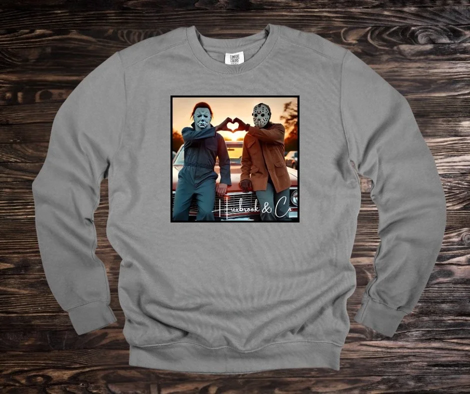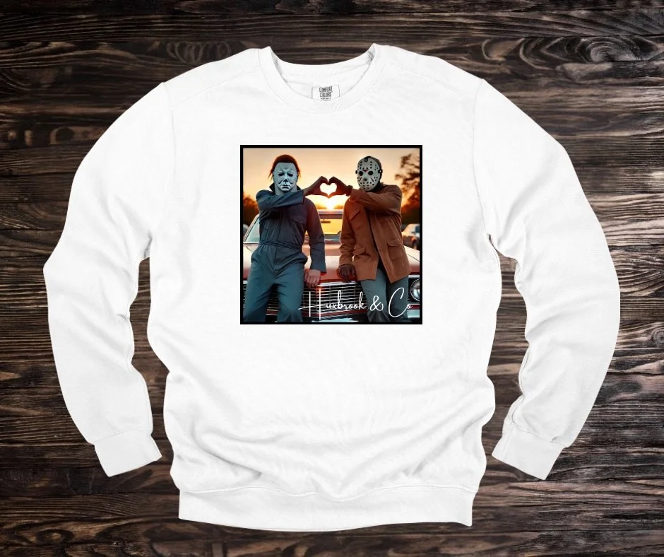 Even horror icons have a soft side! The Slasher Love Sweatshirt features a playful design of Michael Myers and Jason Voorhees making a heart shape with their hands at sunset. This fun twist on two of the most infamous slashers makes the crewneck perfect for horror fans who like their spooky with a touch of humor (and maybe romance). Cozy, bold, and unique – it’s the ultimate sweatshirt for Halloween lovers.
